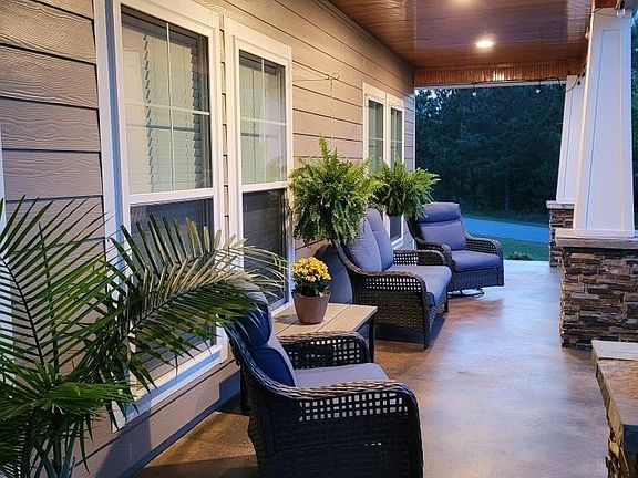 Located in the Lake Juniper community, this 2014 Craftman style home features a covered front and back porch with stone accent columns on the front. At 2,458 square feet of living space it offers 4 bedrooms and 3 bathrooms. The master has an ensuite with walk-in shower, a soaking tub and a walk-in closet with built-ins. All bedrooms have carpet installed in 2021. All other flooring is Mannington LVP also installed in 2021. A 2 car garage with an extra garage space for equipment storage. Living room has a ventless gas log fireplace with a tiled hearth. Kitchen has stainless steel appliances such as a glass top electric stove with double ovens and dishwasher was installed in 2021. All countertops in kitchen and bathroom are granite. All drawers are soft close. Washer/Dryer will remain. House was painted in 2022. Blinds will stay and kitchen window treatments will remain. There is an outdoor kitchen and fire pit for entertaining. The outside stove is a gas cooktop. The outdoor sink has its own water heater. The attic is partially floored for storage and is reached with a staircase. The shingles are architectural.