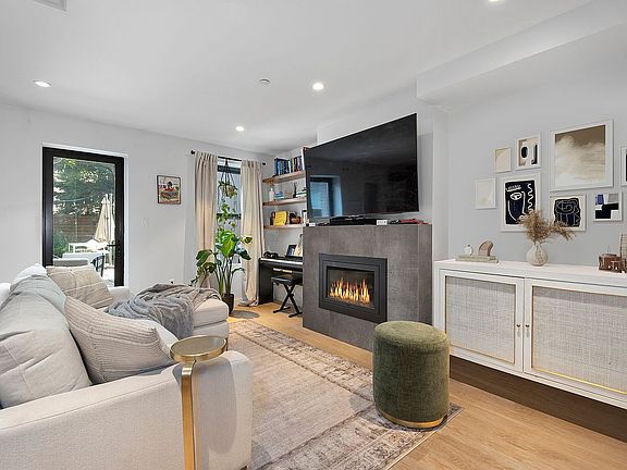 Contemporary fixturesSleek fireplaceExposed brickPrivate backyard retreatNatural lightLower-level flex spacePicturesque brownstone block