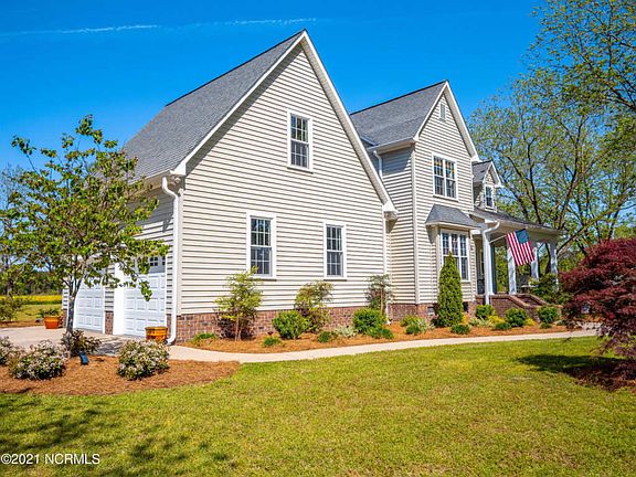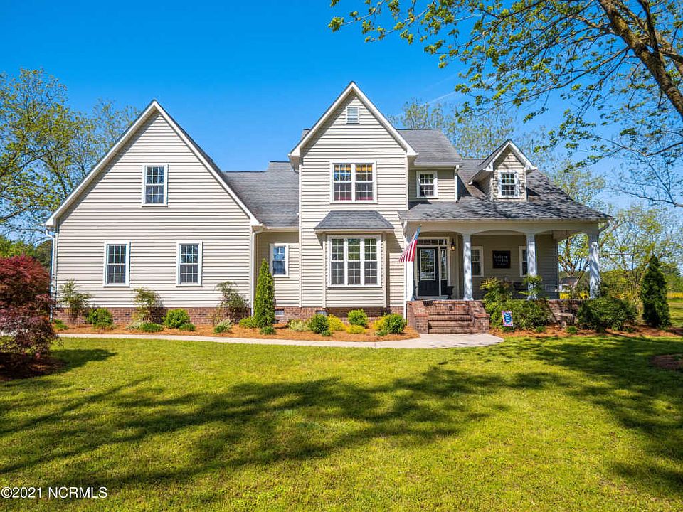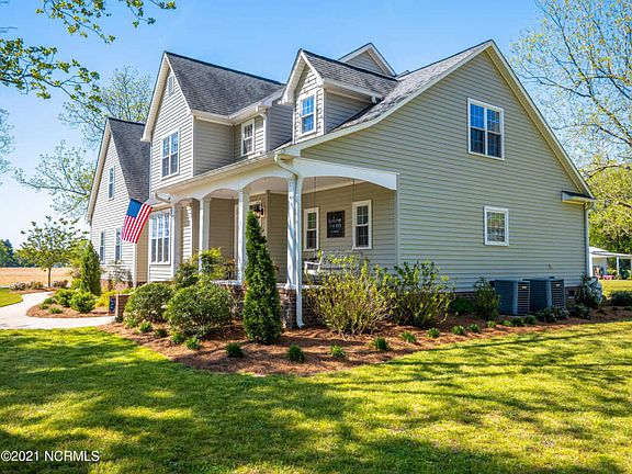 This classic modern farmhouse with Southern Charm is perfectly situated on almost an acre outside of the city limits! This lot is shaded by beautiful mature oak trees and surrounded by expansive farmland views - perfect if you are looking for privacy. The 1st floor features a spacious living room with a fireplace, open eat-in kitchen with vaulted ceiling, formal dining room, laundry/mudroom, and a first floor master suite with a large walk-in master closet and a bathroom to show off! The 2nd floor offers 3 guest bedrooms, full bath & a bonus room. A spacious covered front porch, covered back porch, and large yard welcome you to enjoy time relaxing outdoors. The home features crown molding and recessed lighting throughout the main level. Master Bathroom recently updated to showcase a stand alone soaker tub and beautiful hexagon mosaic tile floors. Crawlspace has been encapsulated and is climate controlled. You will not want to miss the opportunity to view this home! Book your showing today- it won't last long!