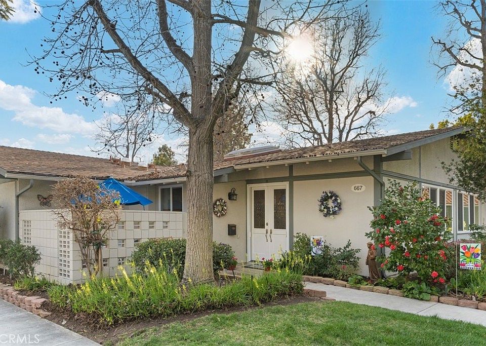 BEAUTIFUL HOME COMPLETELY REMODELED WITH A WONDERFUL CURB APPEAL! This single-level "VALENCIA" model has no steps, no one above or below with a wonderful green belt view and front gated patio to enjoy. You can park in front and walk right in...very convenient & peaceful location! You will love all the upgrades which include central heat and air, washer & dryer, dual pane windows, smooth ceilings, beautiful laminate wood flooring, upgraded baseboards & crown molding throughout, along with plantation shutters. In addition, double door entry and a vaulted ceiling in the living room that leads to the enclosed atrium for additional space... it can be used for an office, TV room, crafts room, and much more! It has high ceilings with skylights. Enjoy the gorgeous open kitchen with stainless appliances, custom cabinets, and granite counters, along with a window above the sink looking out to the front patio. Great entertainment home! Both bedrooms are complemented with custom granite vanities, solar tubs, remodeled walk-in shower with a towel rack, and tiled floors...Also, a sliding glass door leads to the front gated patio. This home is amazing and a wonderful feeling. MUST SEE! Add all this to the amenities offered by Laguna Woods Village and you have a winning combination -- 27 hole championship golf course or the 9-hole executive par 3 courses, tennis, paddle tennis, lawn bowling, 2 fitness centers, 7 clubhouses, 5 swimming pools, equestrian center, gardening opportunities, art studio, world-class woodshop, over 200 clubs and organizations ensure you will never get bored here! Plus, free bus transportation around the community and nearby shopping and bus trips. Also, there is a very economical RV storage area to park your RV. Country Club Living is at its BEST and just approximately 6 miles from beautiful Laguna Beach! "SEE VIRTUAL VIDEO" CARPORT # 493 SPACE 2
