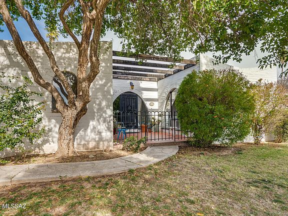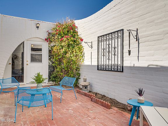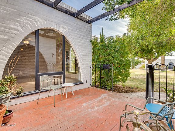 Nestled in the foothills of the Santa Catalina Mountains, Casitas de Castilian (ages 55+) stands as a testament to the seamless blend of regional architecture and history. This architect-designed condo, conceived by the renowned Bennie Gonzales, embodies a townhome ambiance. Boasting two bedrooms, two bathrooms, and two courtyard patios, the residence exudes charm with its exposed burnt adobe walls and arched windows, epitomizing Gonzales' celebrated regional style. Delicate arches adorn the entrance, leading to sunlit interiors with French Oak vinyl floors and mid-century modern fixtures that unfolds into a spacious living room and dining area. The galley kitchen, equipped with pocket doors and stainless-steel appliances (new Amana range and dishwasher), overlooks the rear courtyard.