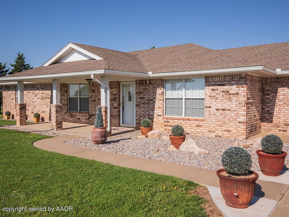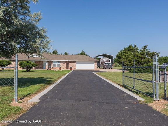 Beautifully cared for one owner home sitting on 2 acres--fantastic curb appeal. Seller's pride abounds. Freshly painted all around, large updated kitchen. New cordless mini blinds all around. Hot tub cabana. Wonderful front porch and back patio. Electric gate is controlled by a remote. RV parking shed measures 18 high by 40 depth with 50 amp breaker near by. Great trees in the back provide a wind break for half the yard. Small fenced area and fully fenced perimeter. 10 x 16 Morgan building with electric serves as office, or craft room. (tool storage for the seller for the time being). Storm shelter measures 9 x 12. Older rabbit shed, garden shed and horse barn not currently used. Compost area. Water heater new and AC serviced, June, 2021. Storm shelter.