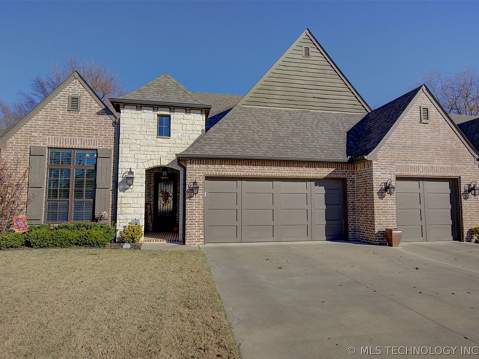 1-LEVEL energy efficient former Executive Homes model home in coveted SEVEN LAKES. 4 bedrooms + study. Distinctive designer finishes include hand-scraped hardwoods, travertine tile, granite throughout, stained wood beam accents in study & great room, stained bead board ceiling in kitchen & stone, gas fireplace. Front study is vaulted & has a closet. Gorgeous open living area has built-in bookcases. Kitchen is amazing! Countertops are abundant plus a large center island. Walk-in pantry. Pot filler over cooktop. Built-in ovens. Private master suite has coffered ceiling, huge bath leading to seasonal closet & laundry room with loads of cabinetry & countertop space. Three additional bedrooms are in their separate, private hall. Bonus drop zone with mail slots near garage door entrance. Vaulted & beamed covered back patio. Bixby North Elementary. Neighborhood pool.