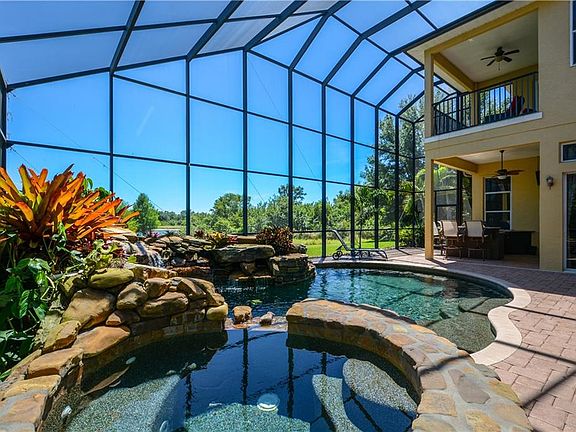 Impressive and exceptional pool home in Lakewood Ranch with 4 bedrooms, 4 bathrooms, bonus room, den, office area and 3 car garage on over a 1/3 acre. This home is on a quiet cul-de-sac with a very large front yard and the southern exposure from the lanai provides an expansive view of the lake and wooded preserve. The home is very bright and open with 12 foot ceilings that have a decorative detail like no other. The gourmet kitchen is adorned with elegantly detailed wood cabinetry, granite, backsplash, hood and stainless appliances. The first floor master suite is complete with a huge walk-in closet and beautifully appointed master bath. Walk-in shower, garden tub, and dual vanities. The office area is complete with built-in wood cabinetry, granite and spectacular saltwater aquarium. The entire first floor has travertine and wood flooring. The second floor has a second master suite, full bathroom, and a large bonus room with its own balcony to enjoy your view of nature. With the two-story caged enclosure, the balcony also overlooks the impressive natural lagoon style pool and spa which is perfect for entertaining. The outdoor kitchen with bar seating completes your unique outdoor living space. Access to miles of trails, and just a quick walk to the Adventure Park, dog park and more. "A" rated schools in walking distance. Easy access to I-75 and shopping, dining, beaches, fishing, golf and entertainment that Lakewood Ranch offers. See virtual tour links for more pictures. This is truly a unique home!