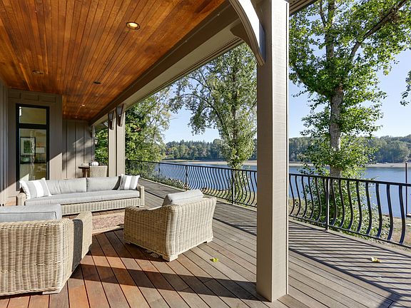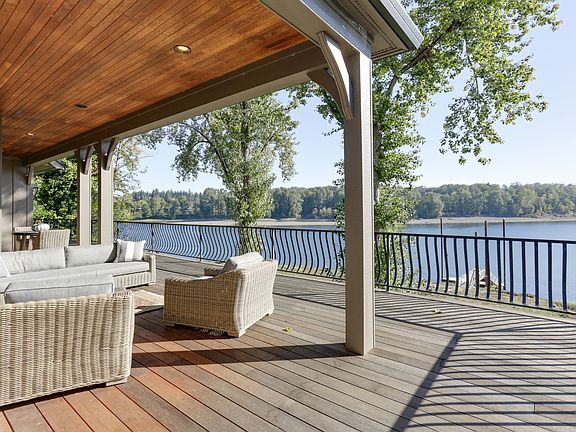 NEW PRICE! Engaging retreat handsomely placed on Westshore of Willamette River. Surrounded by well over an acre of lush green grounds, a sandy beach and deep water boat dock. Open floor plan offers dramatic vaulted ceilings, expansive windows bringing the outside in and a vast covered deck spanning entire riverside of the main level, with access from Master, Family and Living Rooms. Indoor and outdoor living at its finest.