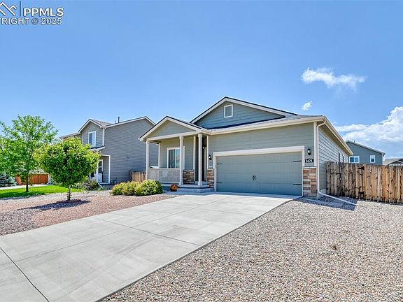 Built in 2017, this charming ranch-style home offers 1,469 square feet of comfortable living space in the desirable Lorson Ranch neighborhood of Colorado Springs. Set in a peaceful suburban area with convenient access to local parks, trails, and open spaces, this home combines ease of living with outdoor enjoyment. Inside, the open-concept layout connects the living, and kitchen areas to create a spacious and inviting atmosphere. Dining has a separate designated area off the kitchen. Three bedrooms and 2 full baths complete the layout. Large windows throughout the home bring in abundant natural light, enhancing the bright, airy feel. The functional kitchen includes modern appliances and ample counter space, perfect for everyday cooking or entertaining. The primary suite features a walk-in tub/shower for added comfort and accessibility. Outdoors, the property sits on a level lot with low-maintenance xeriscaping and a fully fenced backyard—great for privacy and outdoor relaxation. A covered porch tucked into the side yard offers a quiet retreat or a cozy spot to enjoy the Colorado climate. Additional highlights include an attached two-car garage, a crawl space with a vapor barrier already in place - and plenty of extra storage. Located near major military installations and city amenities, this home offers a comfortable, low-maintenance lifestyle in a welcoming and well-connected neighborhood. Come schedule a private tour today!