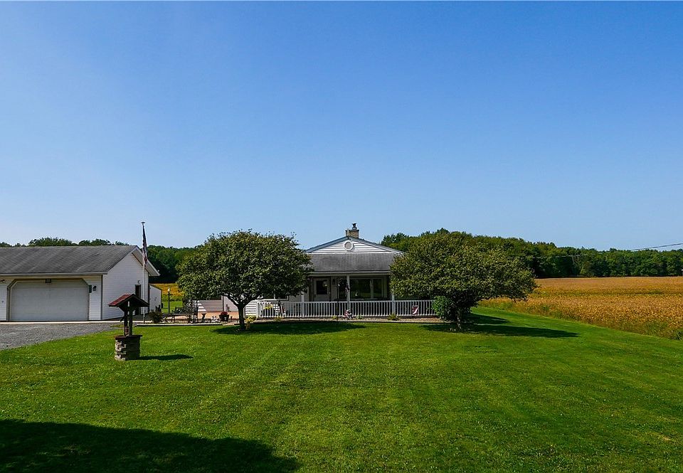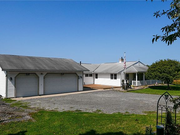 What a great find! Nearly 1900 sq ft Ranch: 32 x 8 covered front porch with peaceful county views and 1.5 acres to garden, relax and play. Detached 3 car garage with storage shelves as well as 2 additional sheds to keep you organized! Front of home-2 Livingroom sitting areas with large picturesque window, newer carpet 2020- and NEW FIREPLACE INSERT-2022. KITCHEN REMODEL -2020 with Amish made countertops. All appliances stay with home as well! Enjoy a spacious, double vanity bathroom and large 20X13 family room with wood stove. Between both wood stoves, furnace runs minimally! Attached to family room is a great entry mudroom or sunroom to be finished and Good sized, sunny laundry/utility room. 2 of the 3 bedrooms have newer carpet, all have wood floors underneath.