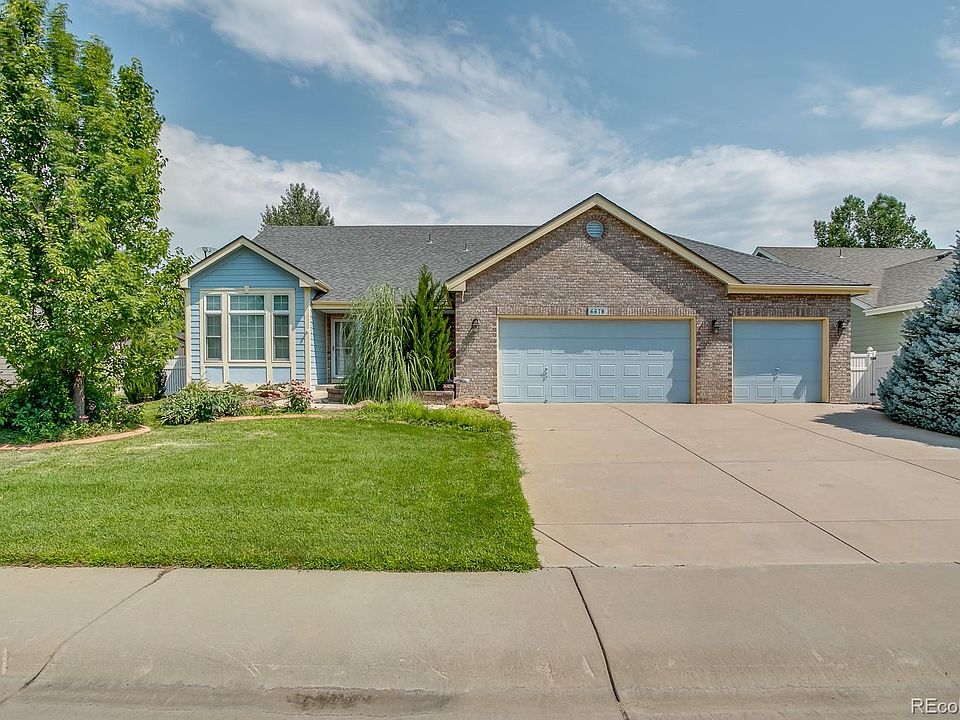 Large ranch style home with a full finished basement in beautiful St. Vrain Ranch. The main level has a very open and bright floorplan that includes a main floor office with double doors, a huge master with a 5 piece master bath, large spare bedroom, formal dining and Living room, eat in kitchen space and a large family room with built ins. Beautiful kitchen opens to the family room and includes granite counters, double ovens, a gas cook top, and a built in desk space. Gigantic finished basement complete with recessed lighting, gas fireplace and a wet bar. Easily has space to finish a 3rd or even 4th bedroom if needed. Wonderful covered deck in the back yard, professionally landscaped front yard including a small coy pond. So much house for the money sitting in a quiet cul-de-sac in a great neighborhood.