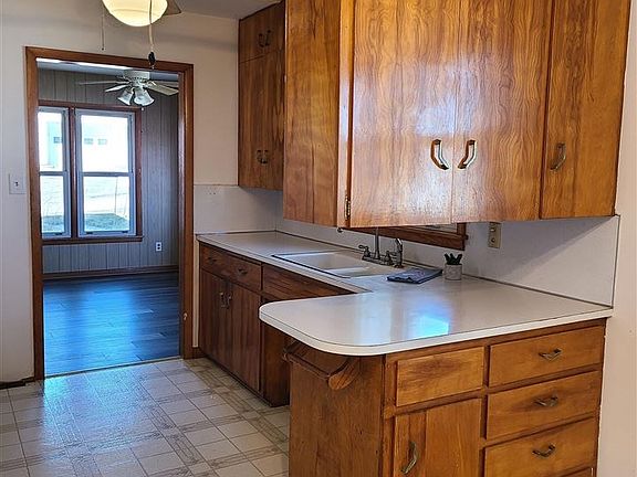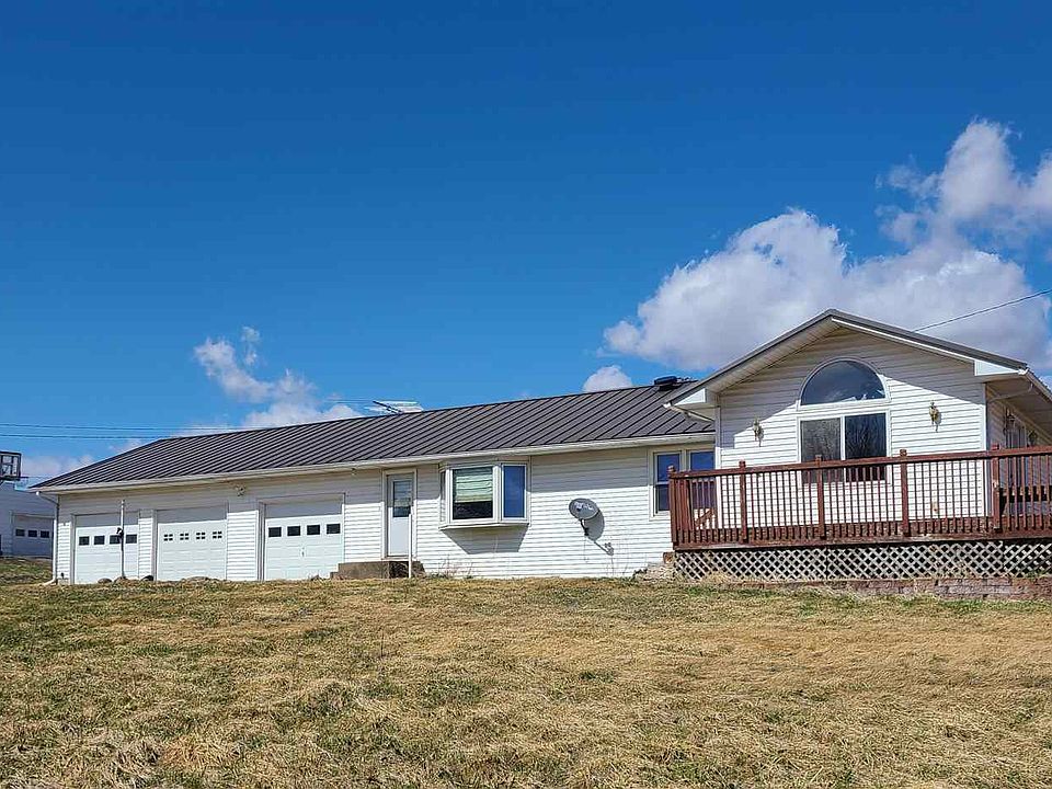 3 bedroom, 2 bath ranch with acreage located on the edge of town. Spacious living room with bay window and built-in display cabinet. Dining room sits just off of the galley kitchen with windows looking over the back yard. Large laundry/mud room with new vinyl flooring, large closet & sink. 2 bedrooms have wood flooring & plenty of closet space. The Master bedroom has a walk-in closet & on-suite bath. The spacious family room has plenty of natural light with a new double door and entry tile. It leads onto the wrap-around deck that would be great for entertaining. The freshly painted basement is wide open space waiting for a purpose. A 3 stall attached garage provides plenty of storage for vehicles or a hobbyist. The acreage also has a barn, small grain bin, chicken coop, corn crib & 2 small storage sheds. Vinyl fencing. LP tank is owned. Rural water. Seller will be responsible for assuring septic compliance.
