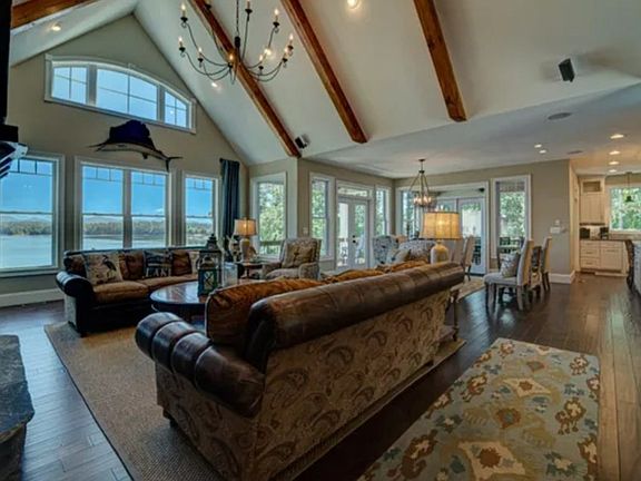 Lakefront stunner with views, views, views!! 6 bedroom, 3.5 bath home located on the North end of Lake Nottely on year round deep water! BBQ deck, lakeside fire pit, hot tub and double decker dock. 2 living rooms, kitchen area on lower level.. perfect for many large familys or lots of guest!