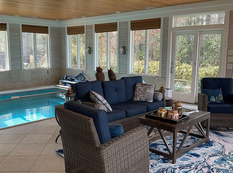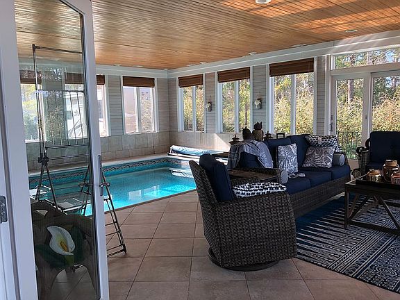 Spa like home with indoor pool, large sauna, double shower for pool room, changing room, high end finishes in tile and flooring, office, large bedrooms with walk in closet, spa jetted tub, built ins along one wall, lux cabinetry, large home office, carolina room, and artists studio above 2.5 car garage. Walls of Anderson windows on waterfront side. House sits on X flood plain so no flood insurance required. One story living. One of nicest homes in pamlico county.Also has garden shed, large parking pad for boat and toy storage plus a 32 foot run in shed with tack room for parking additional toys. Large circular driveway. RV plug in for 30 anmp. Adjacent to 11 acre lot zoned agricultural for equines. Comes with boat slip at community dock.
