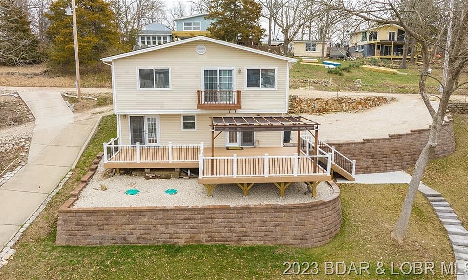 This lakefront escape is the perfect lake getaway! This one has all the must haves - situated in a cove, offers an expansive lake view, tons of parking for family and friends(6+ vehicles), new HVAC in 2020, and new retaining wall & steps to dock in 2022. A new, large composite deck was added last year and offers a pergola with covering for those hot summer afternoons. The home itself presents a reverse floor plan with 3BR/0.5BA and the living room upstairs, while the downstairs has the kitchen, dining area, bathroom, and laundry room. The dual level parking creates an ideal situation so the home can be entered on either level with essentially zero steps. The dock has two 10x24 slips, electric, a sink, wet steps, and comes with a boat lift. Entertainment is close as The Cave Bar & Grill & Nautifish are short boat rides away, and Ozarks Amphitheater is within 10 minutes by car. Come check it out!