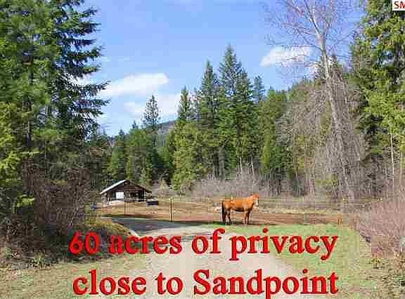 60 magical acres bordering public lands, spectacular mountain views & a pond. Rustic log cabin with all the convenience, privacy & in a great location near nice homes with easy access to Sandpoint. Hike or snowshoe right from your home w/60 acres of beauty & wildlife to enjoy. Power, good drilled well conveniently located off a paved county road & opposite Round Lake State park for fishing & fun. Updated in 2008, new roof, wiring, kitchen, appliances & more. Live here while building your dream home! $398,200 Call Charesse 208-255-6060 #20130994