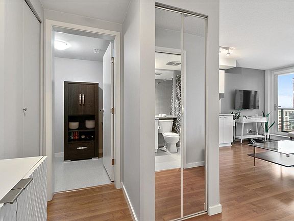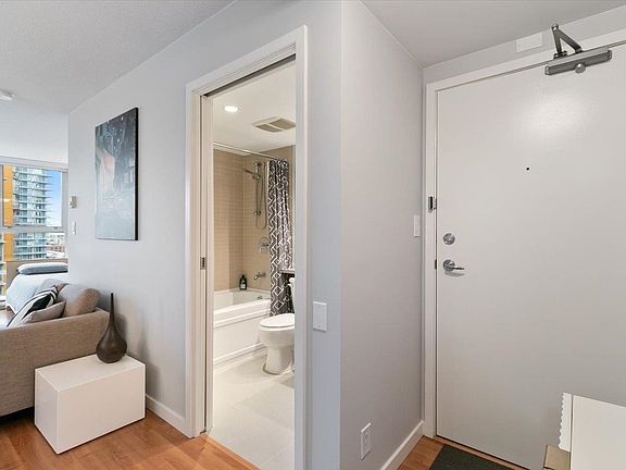 Chic & contemporary junior 1 bedroom city view suite on the quiet side of the building boasts wide plank laminate flooring, new custom blinds and fresh paint + an open balcony that overlooks the serene courtyard & boasts Northshore mountain views! This home is in PRISTINE condition. Quality building built by Concord Pacific. The Spectrum One features amenities which include 24 hrs concierge, swimming pool, exercise facilities, steam, sauna, hot tub, a theatre room, meeting room & party room. OH Sat & Sun, Nov 12th & 13th 1-3pm.