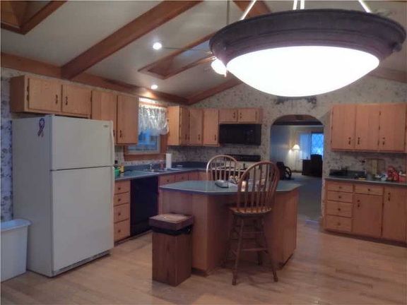 Vacation retreat or full-time residence with fishing at your doorstep!! This well-constructed 3 bedroom 2.5 bath home has been updated and is move-in ready. Beautiful cathedral ceilings with skylights and thick maple trim accent the living and family rooms, as sell as stone floor to ceiling fireplaces. Handmade rustic oak kitchen cabinets and wooden floor are features of the huge eat-in kitchen. Gazebo, 2 car detached garage and a large pole building which can house a semi-truck complete the property!!