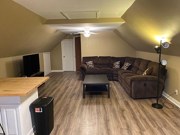 Cozy and charming second floor unit is ready for a new occupant! Spacious great room floor plan combines the kitchen and living room in one large space separated by a butcher block dining counter. Recently installed vinyl plank flooring. Kitchen is equipped with stove and refrigerator and as well as place settings and flatware. Living room is spacious yet comfy with provided wrap around couch, coffee table and smart TV. Bedroom is comfortably carpeted and features queen size bed, built in drawers, shelves and two closets. Television also provided in bedroom. Unit offers central heating and air conditioning through mini-split systems that are controlled in unit. Washer and dryer are provided but shared in a dedicated laundry room on the rear of the ground floor. No shared living spaces! All utilities are provided at the offered rate including internet. This is strictly a no-pets, non-smoking unit (this includes weed y'all). Lease term is negotiable. Call today to set your showing! Utilities Included. Term Negotiable