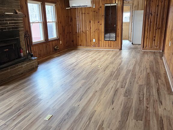 The kitchen includes a stove and refrigerator. A dedicated laundry room with washer and dryer hookups adds everyday convenience. Mini-split heating and cooling provides efficient year-round comfort, while the working fireplace with a wood stove insert adds warmth and charm during cooler months.