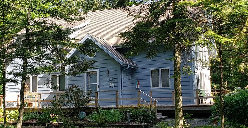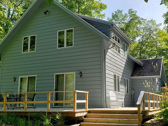 Enjoy your deeded shore access w/this lovely wooded well maintained home. There are many features to mention such as brand new wrap around deck, well maintained walking trails throughout property, lovely gardens & low maintenance yard to name a few. Take a walk through the home & find that it is flooded w/natural light but has window coverings as well. There is a loft on the 2nd floor plus a large master bdrm, master bathroom w/a double vanity, whirlpool tub & walk in shower & also a walk in closet. The 2 bedrooms on the 1st floor each have their own patio doors that open up to a private backyard deck. Wood burning fireplace, recessed lighting and Knotty pine ceiling throughout the home gives it a warm happy feeling. Come take a look