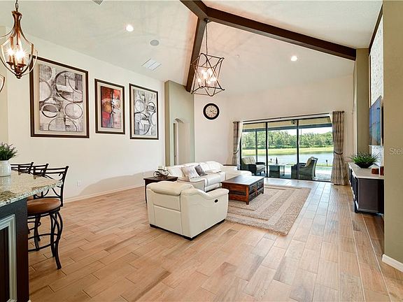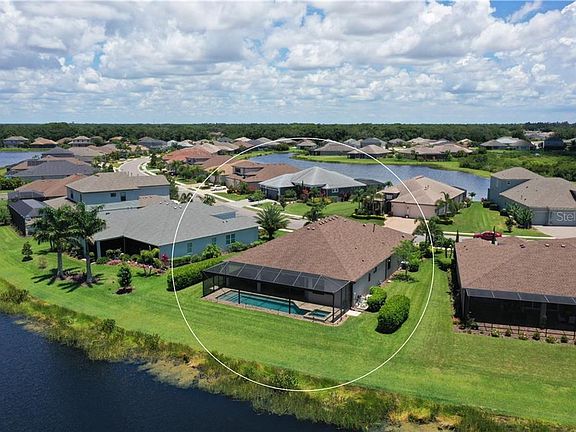 COME HOME TO NATURE in this Homes by Towne custom-built Kingsley Model Masterpiece. Upon entering notice the soaring beamed ceilings in the great room, custom wood/tile work and expansive 'picture window' screened lanai surrounding the pool and spa with your own private 180 degree lake and preserve views, perfectly designed to take advantage of lake views and outdoor space enjoyment. Custom touches throughout: stone accents, arched spaces, skylight, custom closets & built-ins, fantastic saltwater pool, and spa perfectly situated steps from serene lake. Allow the minutes to tick by while enjoying the fish jumping, deer strolling by and birds singing. Some of the extraordinary custom features include wood-look tile flooring, built-ins, crown moldings, high-end tasteful lighting/ceiling fans, surround sound. pre-wired for security system. The kitchen serves as the heart of the home offering solid wood cabinets with soft close doors and pullouts, center island, under-counter sliding microwave, high-end stainless vent, tile backsplash, oversized café area, above and below cabinet lighting and oversized custom pantry . . . all sure to please the discriminating chef! The Master ensuite was built with the homeowner in mind, offering an extra-large walk-in closet with wood built-ins. Three-car garage is finished with speckle-painted flooring. This home has it all and is waiting for you! No flood insurance required. GreyHawk Landing offers lagoon-style pools, playground, basketball courts, tennis courts and community nature areas. Located near I75, shopping, dining, and some of the best beaches in Florida.