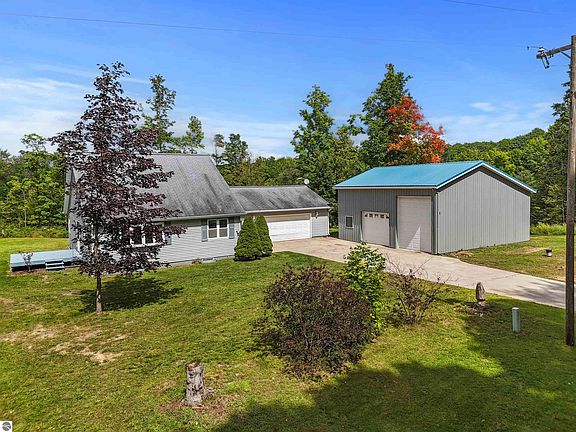 Well-maintained 1 story home with full walkout basement and attached 2 stall garage, situated on 10 wooded acres, large pole barn with workshop and overhead storage. The home features a large mudroom with laundry between the attached 2 stall garage and home. Step up into the galley kitchen with great cupboard space, dining room is located off to side with large windows that bring natural light. As you entered the living room you notice the cathedral ceiling living room and the patio doors that lead to large two level back deck great for outdoor entertaining. There are two bedrooms and full bath are located on the main floor and then follow the stairs down to the partially finished walk out basement; complete with a non-conforming 3rd bedroom and 3/4 bath, pellet stove and walk-out. The 34 x 32 pole barn has many uses with a standard and higher door to accommodate RV's etc, great storage for all your toys or turn into a mancave/workshop. The home is conveniently located only 15 min. to Cadillac and/or Mesick, 30 min. to Traverse City or 20 min to Caberfae or Crystal Mountain and only minutes to two lakes, Manistee River and thousands of acres of State Land and trails for the outdoor enthusiast. For the hunters seller has had very successful hunts on this property. Current updates include a new hot water heater in 2022, rewired pole barn in 2020, newly painted decks, new septic tank and drain field in 2021 and high efficiency furnace and well bladder tank in 2019.