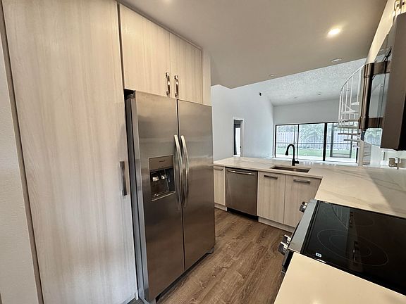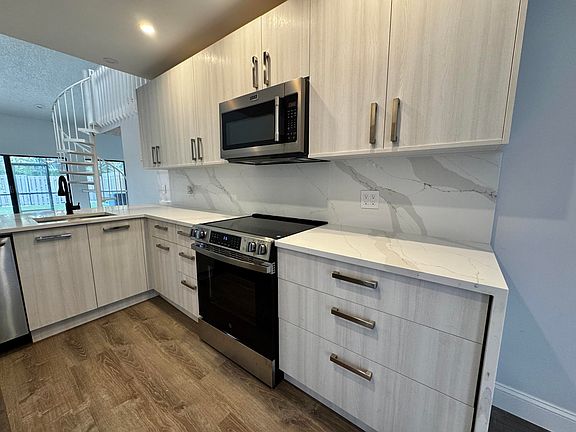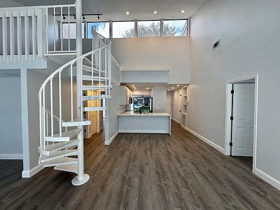 This fully renovated townhouse offers modern style and thoughtful upgrades throughout. The kitchen features granite countertops, soft close cabinetry, stainless steel appliances, and a waterfall style backsplash. New water resistant laminate throughout and tile In the newly renovated bathrooms, creating a warm and seamless flow.Soaring ceilings and large windows fill the home with natural light. A spiral staircase leads to a spacious loft ideal for a home office or flex space. The primary suite includes an updated bathroom with dual sinks, matte black fixtures, a walk in shower, and a skylight. Enjoy a screened patio and a fenced backyard with low maintenance turf and tropical landscaping.