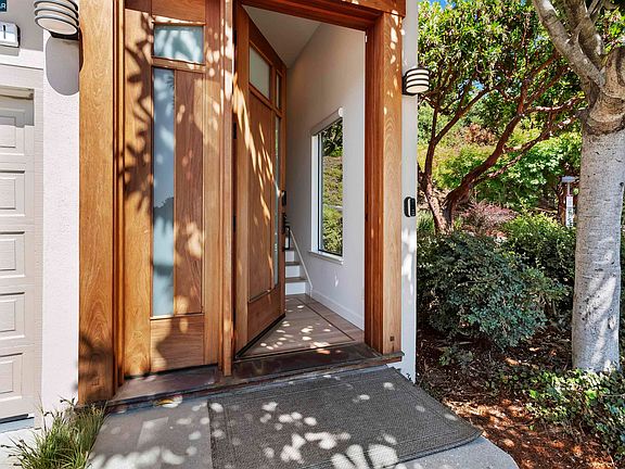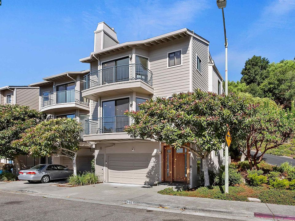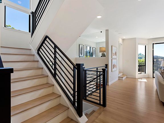 This 2199 SF three bedroom, 2.5 bath, sleek Hiller Highlands end unit townhome, seamlessly combines comfort and style with its functional split-level design. The entry features an attached two-car garage with extra space for storage or as currently used, an exercise room! The main level boasts voluminous windows that shed light and an open feel to the living and dining areas. A recently updated kitchen, equipped with high-end Italian Bertazzoni stainless-steel appliances, is conveniently located next to the bright family room with access to the fenced backyard and turf lawn. Also on this floor is a tasteful, handsomely appointed powder room, a laundry closet and a well-lit office space. The upper-level features three bedrooms and two full, remodeled baths, including a bright, spacious primary suite with a balcony offering city and bay views. Freshly painted interior plus new siding and exterior paint make this home a maintenance free choice for years to come. Location provides easy highway access and proximity to downtown Oakland, San Francisco and Lamorinda which only adds to its accolades and convenience. Tesla solar panels and battery wall. Low Homeowner dues of $250/mo.