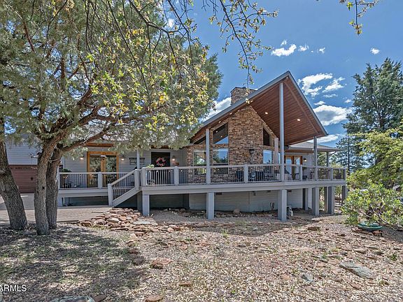 This one of a kind single level home sits in a private cul-de-sac in one of Pine's most desirable subdivisions, Portal IV. The open floor plan features chalet windows to enjoy the spectacular views! New wood plank tile flooring throughout, high vaulted wood ceilings, floor to ceiling stone faced propane fireplace. Spacious gourmet kitchen with granite countertops, 6 burner gas stove and pantry. Split floor plan gives privacy to the large primary suite with deck access. The outside area is incredible! Front covered deck with mountain views and covered back deck. The yard is a park like setting wit a variety of trees including Maple trees, Aspen, and Oklahoma redbud. Fenced area for garden or pets. Propane fire-pit to enjoy the cool evenings with friends and family. The 3 car garage gives room for all your toys! Home is in excellent condition with newer roof, newer dual fuel forced air heat and A/C, newer water heater and newer grinder pump.