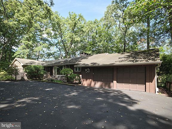 Set on a quiet country road in Solebury Township is this three bedroom/three full bath craftsman style rancher.  Bring your ideas and personal style to this 1972 stone and wood custom built house on 2.1 beautiful acres.  The house has a walk out finished lower level with a wall of windows and glass doors looking out to the rear wooded property.  The lower level has a large walk-in stone fireplace, full bath and lots of storage.  There are three attached garages, a wood barn, and a large shed for storing wood.  The three stone wood burning fireplaces add ambiance and warmth to the kitchen, living room and downstairs great room.  On the main level, the floors are Pennsylvania blue stone and gleaming pumpkin pine wide plank wood.  The main floor living room, foyer and kitchen have solid wood beams on the ceiling.  The dining room has a large bay window and lots of natural light.  The three bedrooms and two baths are on the main level.  The expansive 40 foot deck on the rear of the main floor is perfect for entertaining or simply enjoying the natural setting.  For the car enthusiast one of the garages is oversized and accessed from the lower level of the house.  If you are seeking a bucolic setting within a two to three minute drive to downtown New Hope or Lambertville with all they have to offer, then this property is for you.  Note:  The property address on the mailbox is #86