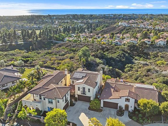 Perched on a ridge in the exclusive Vista Del Mar community, this former model home combines elegance, comfort, and breathtaking ocean views. With only 37 single-family homes in this charming enclave, you will appreciate privacy within the vibrant coastal lifestyle that Carlsbad is known for. Step inside and be greeted by an elevated entry with soaring ceilings, travertine flooring, and a wood and wrought iron staircase. Expansive windows frame captivating ocean and canyon views while providing an abundance of natural light. The dining room features high ceilings and a picture window overlooking the patio, lush garden, canyon, and ocean beyond. Adjacent is the Great Room, where a gas fireplace, large picture window, and glass door invite you to the beautifully landscaped backyard with paver patio and succulent garden—a perfect space for relaxation or entertaining. The chef’s kitchen is thoughtfully designed with granite countertops, dark wood cabinetry, and a GE Monogram stainless steel appliance package, including a double oven, oven/range with griddle, and a large center island with sink positioned to take in the ocean views. Upstairs, the master retreat offers stunning ocean vistas, a spacious walk-in closet, and a spa-like ensuite featuring a soaking tub, step-in shower, dual sinks, and picture windows. Two additional bedrooms share a beautifully appointed bathroom with dual sinks and designer tile finishes. Additionally, the second level features a laundry room with built-in storage for added convenience.
