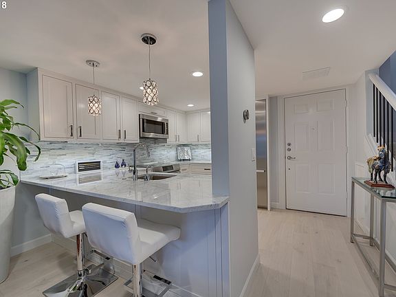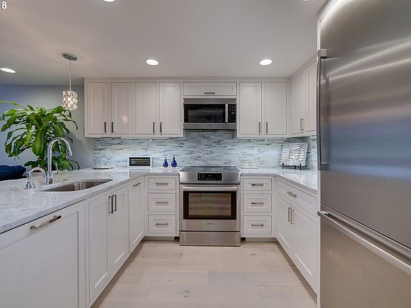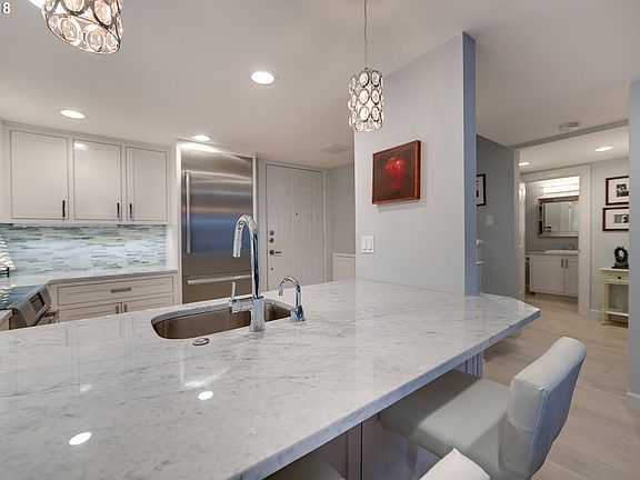 Perfect jewel box of a penthouse, end unit condo close-in to downtown Portland completely remodeled top to bottom in the past year. New custom lighting warms the Carrera marble counters, custom cabinets in kitchen and baths, completely redone baths, wide plank driftwood hued wood flooring, gray plush carpet, new railings & interior doors, new on-demand hot water and understated Carrera marble-faced gas fireplace. Lovely resort living!