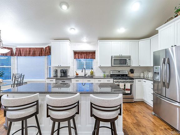 Stunning five bedrooms, three bathrooms, three car garage, ranch style, nestled in a cul-de-sac. Absolutely maintained perfectly and ready to move in. Dramatic entry opening to formal dining and vaulted ceilings. The kitchen is ready for entertaining with a custom island, stainless steel appliances, and granite countertops. The family room with a fireplace leads out to an amazing covered back patio and outdoor space including maintenance-free turf and putting green. The full basement includes two bedrooms, one big bathroom, a wet bar, a gaming area, a workout space, storage, and a movie area with built-in surround sound. The garages are fully finished including custom flooring. Don't miss this beautiful well loved Castle Pines home.