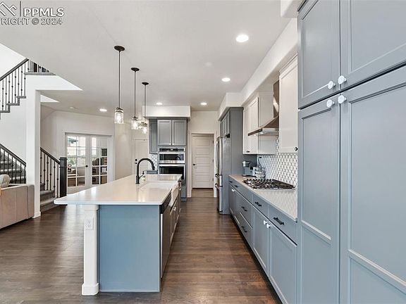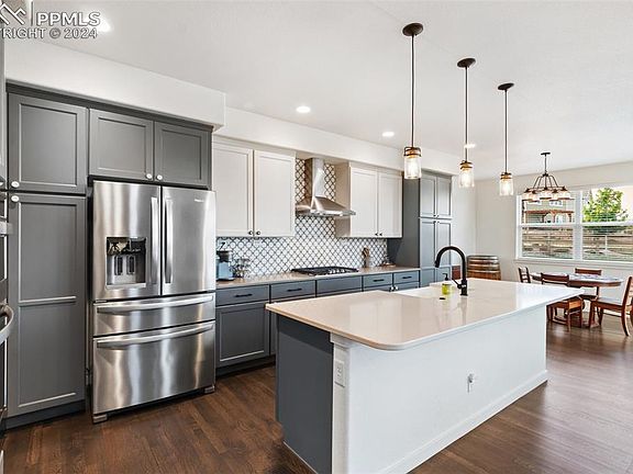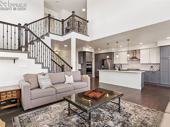 This stunning residence is nestled in the highly sought-after Wolf Ranch community and offers 5 bedrooms & 4 bathrooms combining modern elegance with comfortable living. Key Features: Spacious & open floor plan: The main level boasts an open-concept design with high ceilings, large windows, a fireplace, & hardwood floors, creating a bright & airy atmosphere. The living room, dining area, & gourmet kitchen flow seamlessly, perfect for both everyday living & entertaining. Gourmet Kitchen: The chef's kitchen is a culinary delight with top-of-the-line stainless steel appliances, quartz countertops, designer backsplash & cabinets, a large center island with seating for 4, & ample cabinet space. The adjoining dining area opens to a patio, ideal for grilling & alfresco dining. Luxurious Master Suite: The primary bedroom is a private retreat, featuring a walk-in closet and an en-suite bathroom with dual vanities, a water closet, and a huge glass-enclosed designer shower. Finished Basement: The finished basement offers an additional bedroom, bathroom, a family room, & beautiful wet bar. The movie room is the perfect place to enjoy movie or game nights. Outdoor Oasis: The beautifully landscaped backyard is one of the largest in the neighborhood & is perfect for outdoor gatherings & relaxation. Enjoy the Colorado sunshine on the expansive patio. Community Amenities: As a resident of Wolf Ranch, you'll have access to a variety of community amenities, including parks, trails, a clubhouse, & a community pool. Location: Conveniently located near shopping, dining, and entertainment options, this home offers easy access to major highways & is just a short drive from downtown Colorado Springs. Enjoy the perfect blend of suburban tranquility & urban convenience in this beautiful home. Don't miss the opportunity to make this exquisite property your new home. Schedule a showing today to experience the luxury and comfort of this amazing residence.