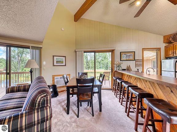Escape to this charming condo, perfectly situated to take in breathtaking views of both the Schuss Mountain ski slopes and the golf course. Whether you're hitting the slopes in winter or teeing off in summer, this property puts adventure and relaxation at your doorstep. Inside, you'll find a warm and inviting living space, complete with a wood-burning fireplace—a perfect spot to unwind after a day of outdoor fun. The kitchen features a stylish island with seating, ideal for casual meals or entertaining guests. Convenience is key, with an in-unit laundry to make your stays as effortless as they are enjoyable. This condo has been a proven success as a short-term rental, offering a fantastic opportunity for income potential or your own private getaway. Experience the perfect blend of coziness and adventure—your mountain retreat awaits!