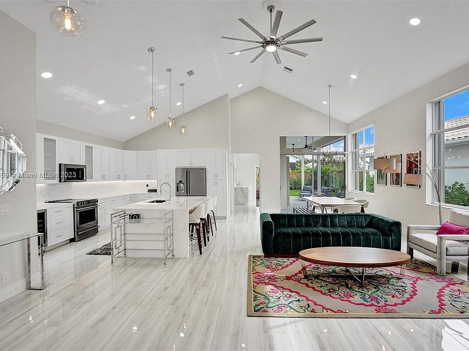 Contemporary & elegant, fully renovated turn-key home situated in beautiful Broken Sound, a gated 5 Star Platinum Club for golfers. This home boasts luxury high-quality craftsmanship & finishes. Vaulted hi-ceilings, abundant natural light spanning across open concept kitchen with large island, granite edge waterfall counter top, professional Frigidaire appliances, & wine fridge with small bar. Porcelain floors throughout & luxurious marble tiled bathrooms, floating vanities & backlit mirrors. (True 2 bed 1 flex) Accordion shutters. NEW: TILE ROOF, electrical panel, hurricane impact front door & garage door, fence & landscaping. Appliances warranted & one-year construction warranty on the home. Clubhouse is undergoing $30M renovation. A-rated schools! Furniture excl, however for sale.