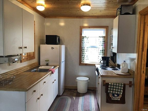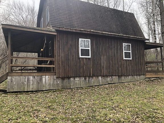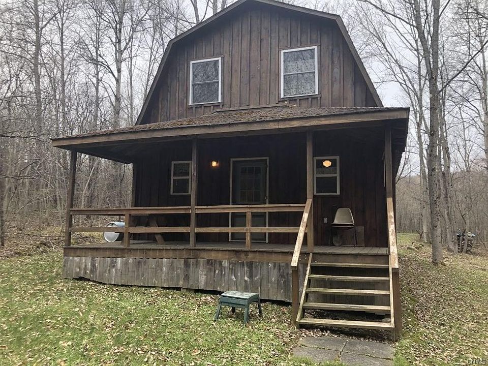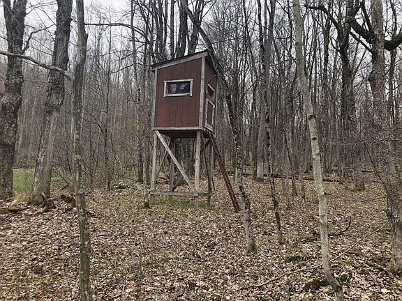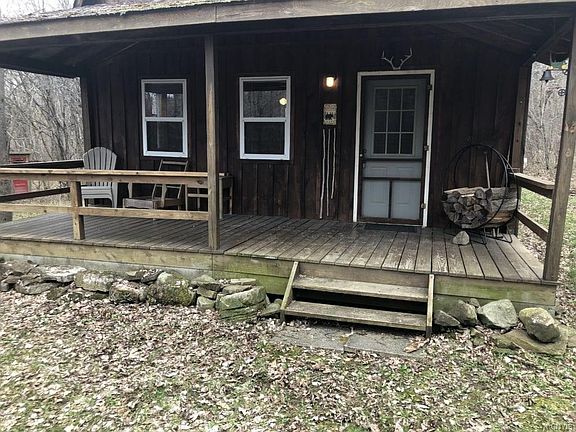 The cabin is very well insulated with all Vinyl Windows. Includes a kitchen, spacious living and dining room, and a wood stove that creates plenty of heat. The ceilings are 8 inch knotty pine. Upstairs are the 2 bedrooms, and the beds can be part of the sale. Enjoy the large front and back porch for relaxing, watching the wildlife and listening to the running stream. The land has an abundance of mature hardwoods and is level for easy hiking. There is a fully enclosed tree blind, as well as other tree blinds on the property. Great hunting! And just a few 100 ft. from over 4,700 acres of State land. Located on a year-round maintained road. Near the popular Palmers Pond (NY State Stocked) for fishing. Close to Polly Wog Holler Eco-Resort, and a short drive to Interstate 86.