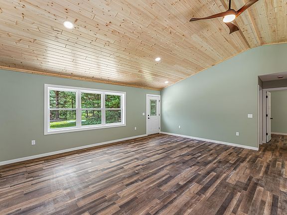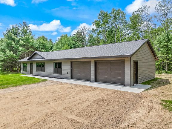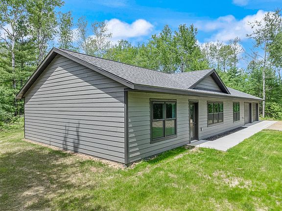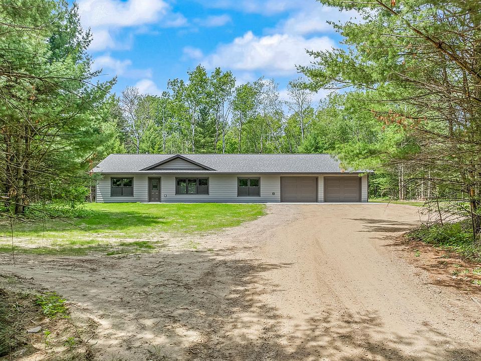 New construction ranch home on a beautiful wooded lot in Three Lakes. This contemporary open concept design encompasses a split floor plan with a heated 2+ car garage. The knotty pine vaulted ceiling and color scheme tastefully bring a designer touch to the interior. White kitchen cabinetry and quartz counters, stainless steel appliances make this kitchen/ dining area really shine. This home has three bedrooms that include a master with attached bath and walk-in closet. A private back yard with a patio is accessible via sliding door. Need a workshop space? The oversized attached garage is heated and insulated. Private driveway is in and the yard has been seeded. With 2.5 acres there is room for an additional garage. Everything here is new, no work to be done and move-in ready!