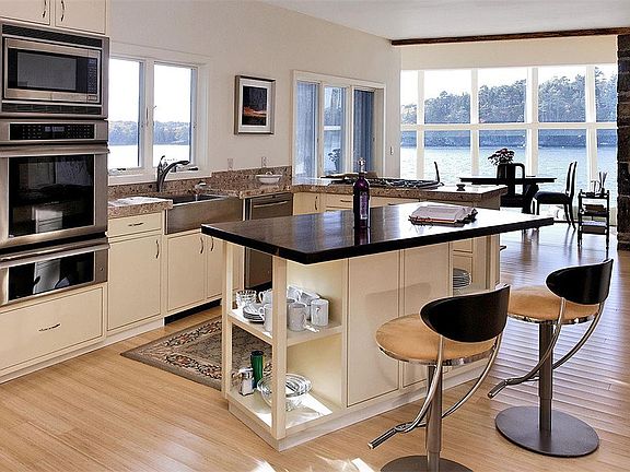 Gorgeous, waterfront mid-century modern style home, featured in several design and architectural magazines. Stunning 18 ft. wall of windows overlooking the water, heated in-ground swimming pool, architect designed outdoor entertainment area, private location, deep water dock, massive stone fireplace, air-conditioning, sprinkler system, professionally landscaped, private entrance road, stream with waterfalls, whole house generator.