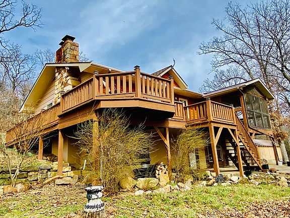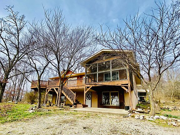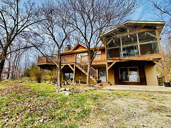 Shh! What do you hear? Quiet Country Living! The View is so Awesome! Looking over pasture and hills. You can see for miles while setting out on your deck. The deck wraps around to sides of the home. It also has a screened in area coming of the master Bedroom. The view out the kitchen window is amazing with flowers and a limestone rock bluff. Almost 10 acres part pasture part wooded. There is a master bedroom upstairs, open floor plan and another 1/2 bath. Kitchen Cabinets & pantry have pull out shelving. Walkout basement has a bedroom, kitchenette and laundry room. Wood burning fireplace upstairs and wood burning stove down stairs.