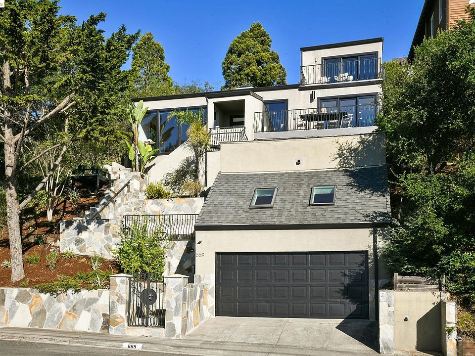 Welcome to 669 Euclid, a stunning contemporary residence in the Berkeley Hill with breathtaking panoramic views of the Bay. This home features 4 spacious bedrooms and 3.5 bathrooms. The main level has been thoughtfully designed with a bright, open-concept layout, with soaring vaulted ceilings in the living and dining room areas. The updated kitchen offers an inviting eat-in space that leads directly to a balcony, perfectly positioned to showcase stunning views of the Golden Gate. On the main level, you'll also find practical amenities: a laundry room, a sizable pantry, and a convenient half bath. Three bedrooms are located on the same level. Two share a jack-and-jill bathroom and one has its own en-suite. Up a few steps, the primary bedroom has a generous walk-in closet and a luxurious  spa-like bathroom. Wake up to breathtaking views of the Golden Gate, visible from the entire first floor and from your own private balcony. There are many outdoors spaces: multiple balconies, a terraced garden and a veranda at the top that could be where the hot tub goes... or perhaps an orchard? A detached studio space is ideal for a home office, and a functional two-car garage adds to the convenience of this home. Being on Euclid Ave, you are just a few minutes from North Berkeley down the hill.