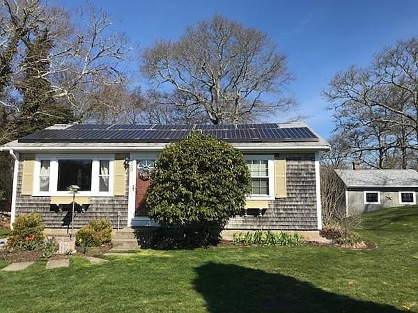 Adorable ranch with open floor plan. Completely remodeled in 2013 (windows, insulation, drywall & plaster, heating, electrical, plumbing). Kitchen has bib sink, kraft-made cabinetry, stainless appliances, granite & butcherblock countertops and a breakfast bar. It opens to living/dining area with vaulted ceiling, ceiling fan and recessed lighting. Two bedroom septic installed in 2012. The large 18 X 20 storage buiilding was remodeled in 2018 and boasts a new roof, cupola, siding, windows, electrical & sliding barn door plus a spacious patio with a fire pit. Home is bright and sunny with a bucolic southern exposure and is sited on a large level lot with blueberry bushes, gardens, fencing and stone walls. Solar panels (leased & transferrable) make this home extremely energy efficient. A precious gem and just minutes to the beach!!