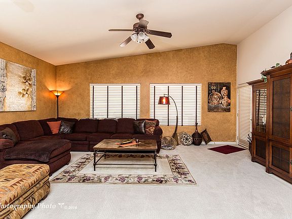 This gorgeous custom home is located in the Pinnacle 2 Gated golf course community. The Arnold Palmer Oasis Golf Course, Sports Club and two restaurants are within walking distance and the Home Owner's Association is ALL inclusive. The floor plan is open and bright and the custom warm paint tones throughout are a plus. Enjoy gorgeous slate floors, staggered, Knotty Alder Ontario raised panel cabinets, under and over cabinet lighting, 36" vanities and tile bathroom surrounds, vaulted ceilings, custom window coverings, water softener and R/O. The master bedroom is spacious and has a door out to the tiled, covered patio. The secondary bedroom/office features a round wall of picture windows which have sun screens to keep it cool in the summer months. Additional depth in the garage allows room for a golf cart and/or storage. Fully fenced makes this a great backyard to sit and listen to the water feature and for pets.