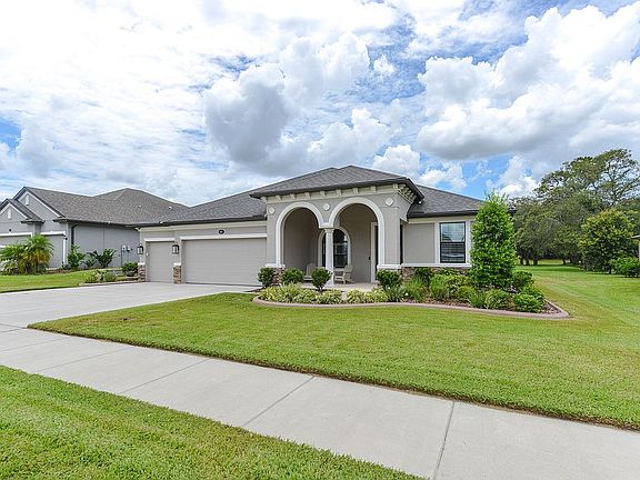 Beautiful 4 bed + study, 4 bath pool home with oversized 3-car garage located on a dead-end street 5 minutes from the Suncoast Parkway is looking for a new family.  Decorative curbing surrounds the outside of the home, and the open floor plan is amazing with one room flowing into the next.  Remarkable tray ceilings in the dining room and master bedroom, archways leading from formal dining room into the living room, and tiled floors in the main areas make easy maintenance.  The carpeted master bedroom has a tray ceiling, its own private bath with upgraded counter height cabinets, granite countertop with dual sinks, walk-in shower, garden tub and a large walk-in closet.  The 3 carpeted guest rooms are light and inviting.  The kitchen is amazing, with upgraded cabinets, stainless steel appliances, plenty of lights, and a good-sized pantry.  This home also comes with a study complete with pocket doors for privacy that is currently being used as an exercise room and is adjacent to the pool bath with walk-in shower.  The back yard overlooks the common area and has a lovely caged 32 X 14 saltwater pool is surrounded by pavers and an alcove for outdoor dining!  Additional upgrades include plantation shutters in most rooms, roll down shades overlooking the lanai area, a Culligan whole house water softener, ceiling fans in all the rooms, and a 4K security camera system. The oversize 3 car garage offers overhead storage racks, attic storage area, utility wash tub, 24ft of combination work/storage benches along the wall (optional to stay with house) and still room to comfortably walk around full size vehicles. For the outdoor enthusiast the Suncoast Recreation Trail head is across the street from the community entrance.  Low HOA fees this home has it all!