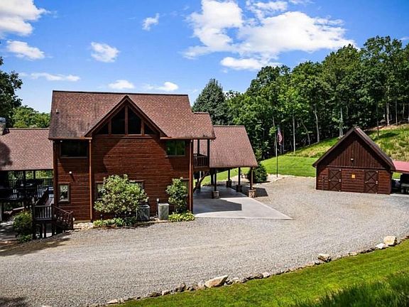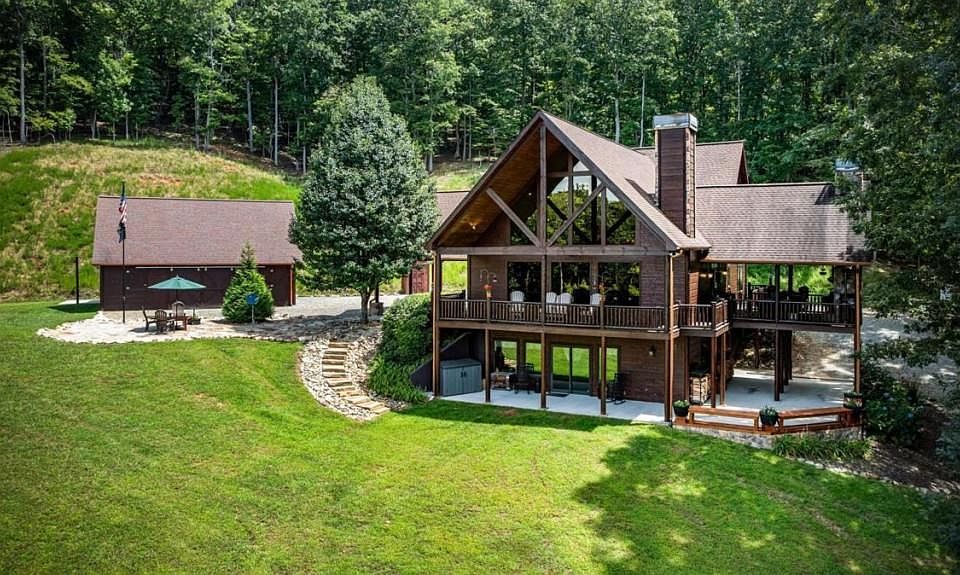 Gorgeous Mountain Lodge on 11.5 Acres!!! A True North Georgia Retreat Escape to your own private mountain paradise with this spectacular lodge, nestled on 11.5 pristine acres and bordered by U.S. Forest Service land for unmatched seclusion! Designed for both comfort and functionality, the property includes a versatile workshop/garage with storage space and a serene small stocked pond. Step inside the magnificent great room, where a dramatic wall of windows frames breathtaking vistas, while beautiful hardwood floors and a soaring stacked-stone fireplace with a Harman Pellet Stove insert set the tone for mountain lodge living at its finest. The open-concept design flows seamlessly into the large dining area and a chef's kitchen with recently upgrades appliances, featuring granite countertops, double ovens, prep sink, and a solid cedar 8-person bar perfect for gatherings. The main level offers two spacious bedrooms with walk-in closets, a stylish full bath with tiled shower, and a convenient laundry room. Upstairs, the expansive master suite impresses with a private deck, walk-in closet, luxurious spa bath with a 2-person tub, tiled shower, double vanities, and a private water closet. The terrace level is built for comfort and versatility, offering two additional bedrooms, full bath, wine and cigar room, wood-burning stove, safe room, and abundant storage. Outdoor living is equally impressive with wrap-around covered porches, a party deck with outdoor fireplace, and long range mountain views that set the stage for unforgettable entertaining or peaceful solitude. Modern comforts include dual HVAC systems (one dual fuel), tankless hot water heater, and energy-efficient Pella windows. This exceptional property is more than a home it's a lifestyle, where privacy, luxury, and natural beauty come together in the heart of the North Georgia mountains.