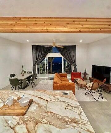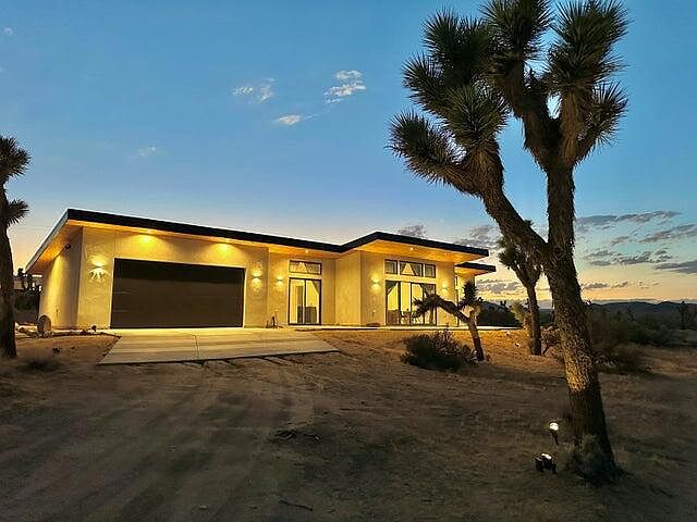 OFFERED FURNISHED W/SOLAR! BRING OFFER!Welcome to your dream retreat in Joshua Tree! This stunning modern home comes fully furnished and offers 1,032 square feet of thoughtfully designed living space featuring clean lines and abundant natural light. The open-concept layout seamlessly connects the living area to a contemporary kitchen, perfect for entertaining. Enjoy two spacious bedrooms and bathrooms. Enjoy the convenience of an attached 528 sqft garage, RV hookups and a paid oversized solar system. Ideal for the outdoor enthusiasts and ensuring energy efficiency. Step outside to an inviting outdoor shower and expansive yard ideal for stargazing and enjoying the serene desert landscape. The expansive lot provides plenty of room for a swimming pool, allowing you to create your ideal outdoor retreat with endless possibilities. With contemporary finishes and thoughtful design, this home is an ideal turnkey retreat for those seeking both tranquility and modern amenities. Just minutes from the iconic Joshua Tree National Park, this home is a rare opportunity to embrace modern living in nature. Comes Furnished, Inventory list will be provided.
