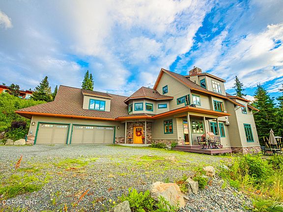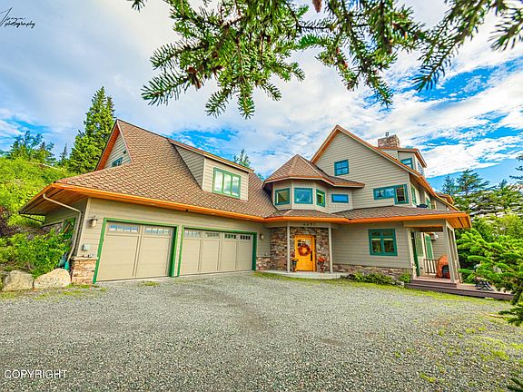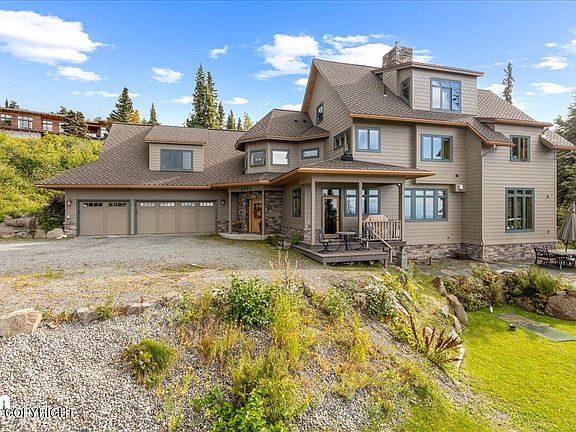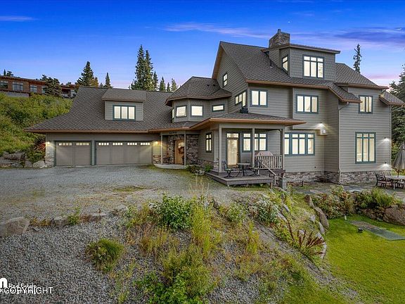Magnificent Custom-Built Home on Shangri-La Circle, Anchorage. This exquisite home offers unparalleled luxury and breathtaking views of Denali, downtown Anchorage, Mt. Susitna, and Sleeping Lady. Every detail has been meticulously crafted, from the Douglas fir wood trim throughout to the study's stunning mahogany coffered ceilings and American walnut wood floors, which also grace the master....bedroom. The home is equipped with a state-of-the-art Sonos surround sound system throughout, perfect for creating the ideal ambiance in every room. A massive craft and hobby room provides ample space for creative projects. The kitchen is a chef's dream, featuring soapstone countertops, cherrywood cabinets, and slate flooring imported from India. Outside, enjoy peaceful walks through the 2.4-acre property, complete with serene walking trails and a Japanese garden with a waterfall and creek. A flagstone walkway and patio offer stunning views of Anchorage, which is ideal for outdoor entertaining. Additional features include Trex decking and presidential shake shingles with a lifetime warranty. This home is truly a sanctuary of elegance and tranquility.