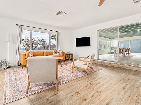 Stylish and serene 3-bedroom, 2-bathroom desert retreat for rent! Offering 2,000 square feet of beautifully designed living space. Featuring a bright and airy interior with mid-century modern touches. The open-concept dining area provides stunning panoramic views of the surrounding desert landscape, perfect for relaxing meals or entertaining with friends. Step outside to enjoy the peaceful desert atmosphere, complete with mountain views and natural surroundings. Whether you're stargazing through the expansive windows, sipping coffee in the sunroom, or heading out to explore nearby Joshua Tree attractions, this home is the perfect blend of comfort and style in the heart of the desert. The granite tub is the highlight of the yard. It can be filled up with hot water throughout the year. There is also a fire pit and a cowboy tub for you to enjoy. Lease term for one year or longer. One year or longer lease, renter pays utilities.