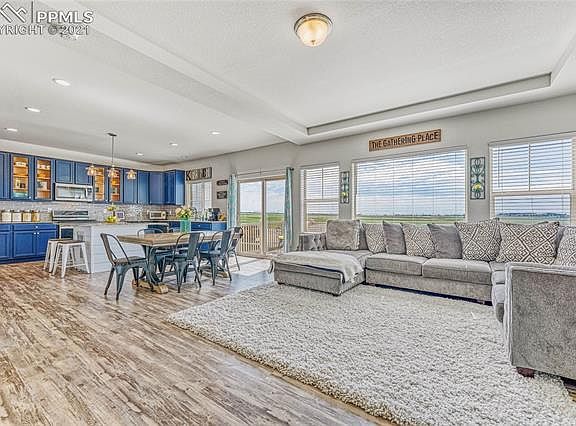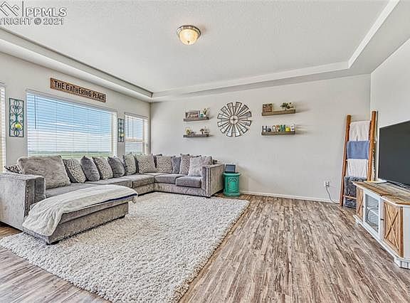 Welcome to this open concept home located in Banning Lewis Ranch. This modern farmhouse hosts 5 bedrooms, 4 baths and a finished walk out basement. On the main floor you will find engineered vinyl planks (EVP) throughout with an open concept living room, dining room and kitchen. There are granite countertops, stainless steel appliances, a walk in pantry and an over sized island that is perfect for extra seating during gatherings. Moving upstairs, you will find a generous laundry room, 3 bedrooms, full bath and the master bedroom. In the finished basement you will find a large storage area and living space with a dedicated built in desk perfect for homework. There is another bedroom and full bathroom to complete this level. Walking outside you will find a well maintained yard complete with a built in 14 foot trampoline, turf and a large concrete patio for seating. Both the front and backyard have been xeriscaped for minimal maintenance and low watering. Banning Lewis Ranch has numerous amenities with a Ranch house, Splash Park, Dog Park, Pickle Ball Courts and over 65 miles of trails.
