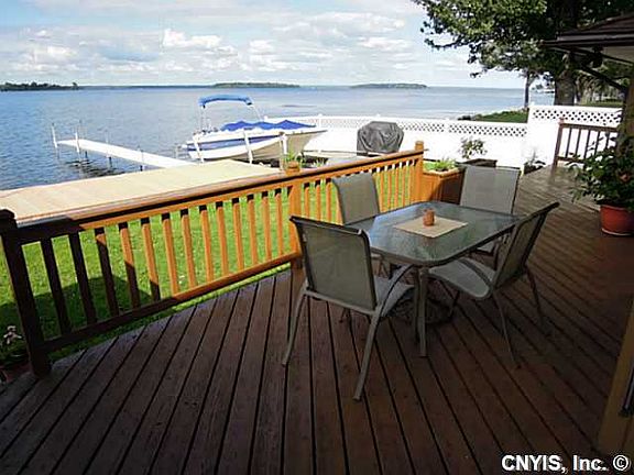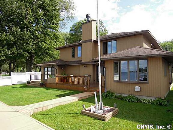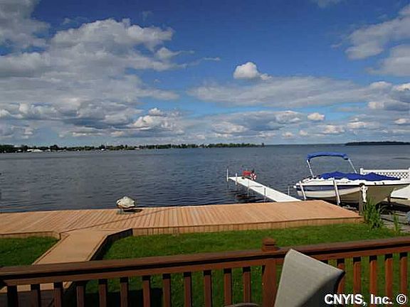 Stunning, regal 4 bedroom lake-front home on Oneida Lake with 65ft of waterfront on a private drive. Custom-built home with vaulted ceilings and a 2 story foyer boasts a kitchen w/breakfast bar, a morning room, a center island, formal living and dining rooms, a first floor master bedroom w/ bathroom, and an expansive deck on the entire back side of the home which is asscssible from the 1st floor Master Suite, the Family room and the Morning room. The home also includes 2 fireplaces, a second Master Suite, a dock and boat launch on beautiful, landscaped land. Whole house electric generator.