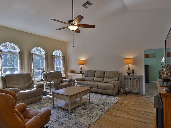 Take a look at this gorgeous 2/2 on 20 acres in Bell Fl! This beautiful house has over 1700sq Ft of living space with an open floor plan & large eat in kitchen with wood cabinets. You'll find long plank porcelain tile throughout the living spaces & new Berber carpet in bedrooms. Large 12x20 master suite with walk in closet & French doors that lead out to the screened porch, on cooler days & nights cozy up to the newer gas fireplace that was installed in 2020. property backs to agricultural and forestry land. Enjoy watching the abundant wildlife. There are 3 deluxe elevated blinds & 2 feeder stations on the property. There is a 30x60 steel building with 3 10x10 roll up doors & 1 12x12 roll up gable door & is on a 6 in slab. There is also a 10x12 outbuilding with metal roof. There are also two adjacent lots available 13 & 7 acre parcels. This house sits 500ft off the roadway and has 2 gated entrances with 14ft gates. There is too much to list! Call to see today!