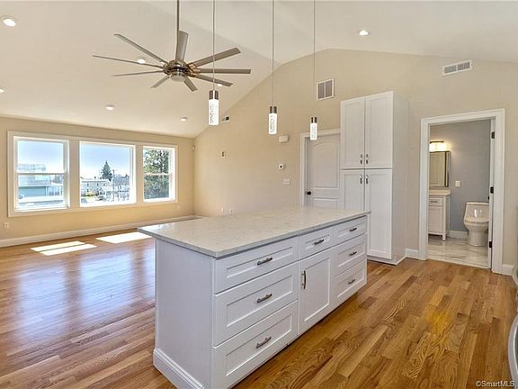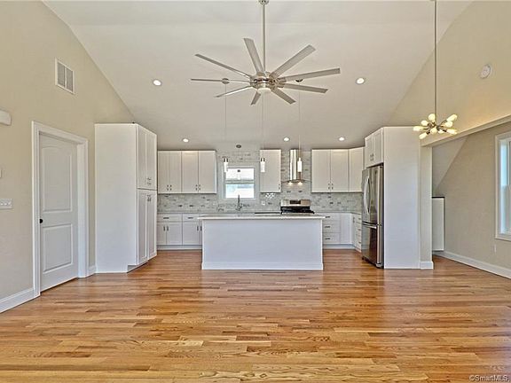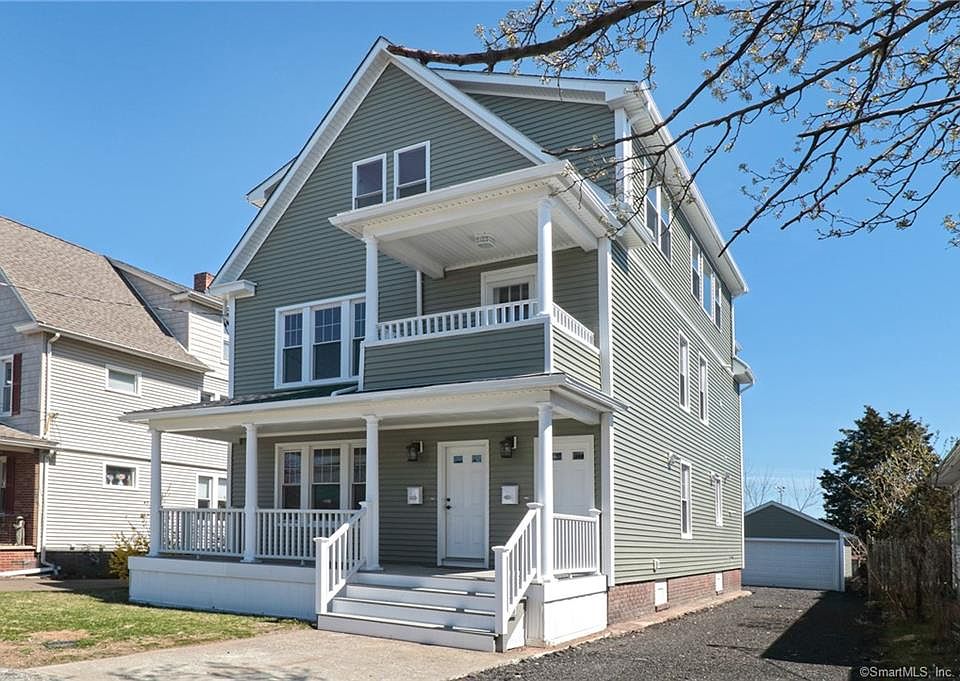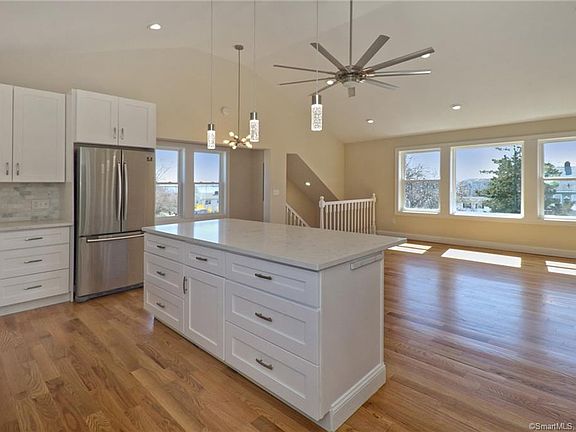 Amazing Manhattan Style Townhouse with 4 bedrooms and 2 full baths on the upper level of this completely rebuilt multi-family. Luxury styled apartment with upper level center island kitchen, dining room and family room combination and Master Bedroom Suite designed to capture views of Long Island Sound. The main level has 3 spacious bedrooms, access to private balcony/deck, full bath, living room with built in cabinet and counter designed for small refrigerator or wine cooler and snacks, and separate laundry room. The upper level of this townhouse breathtaking from design to water views. Cathedral ceiling, stylish ceiling fans, trendy chandelier, pendant lights and recessed lighting sparkle across the family room and dining room areas onto the quartz top center island with breakfast bar large enough to seat 4. Exquisite custom tile back splash, self close new shaker style white cabinetry, gas range with stainless steel hood vent, stainless steel refrigerator and dishwasher. The Master Bedroom Suite has very large walk in closet, 2 additional closets and Jack and Jill full bath with beautiful tiled tub with shower, porcelain tile floor. New hardwood floors are found throughout this apartment as are wall connections for wall mount TVs. This unit also includes use of detached 2 car garage. New heating and cooling for optimum energy efficiency. There's nothing not to love with this townhouse apartment. Sorry, no pets accepted.